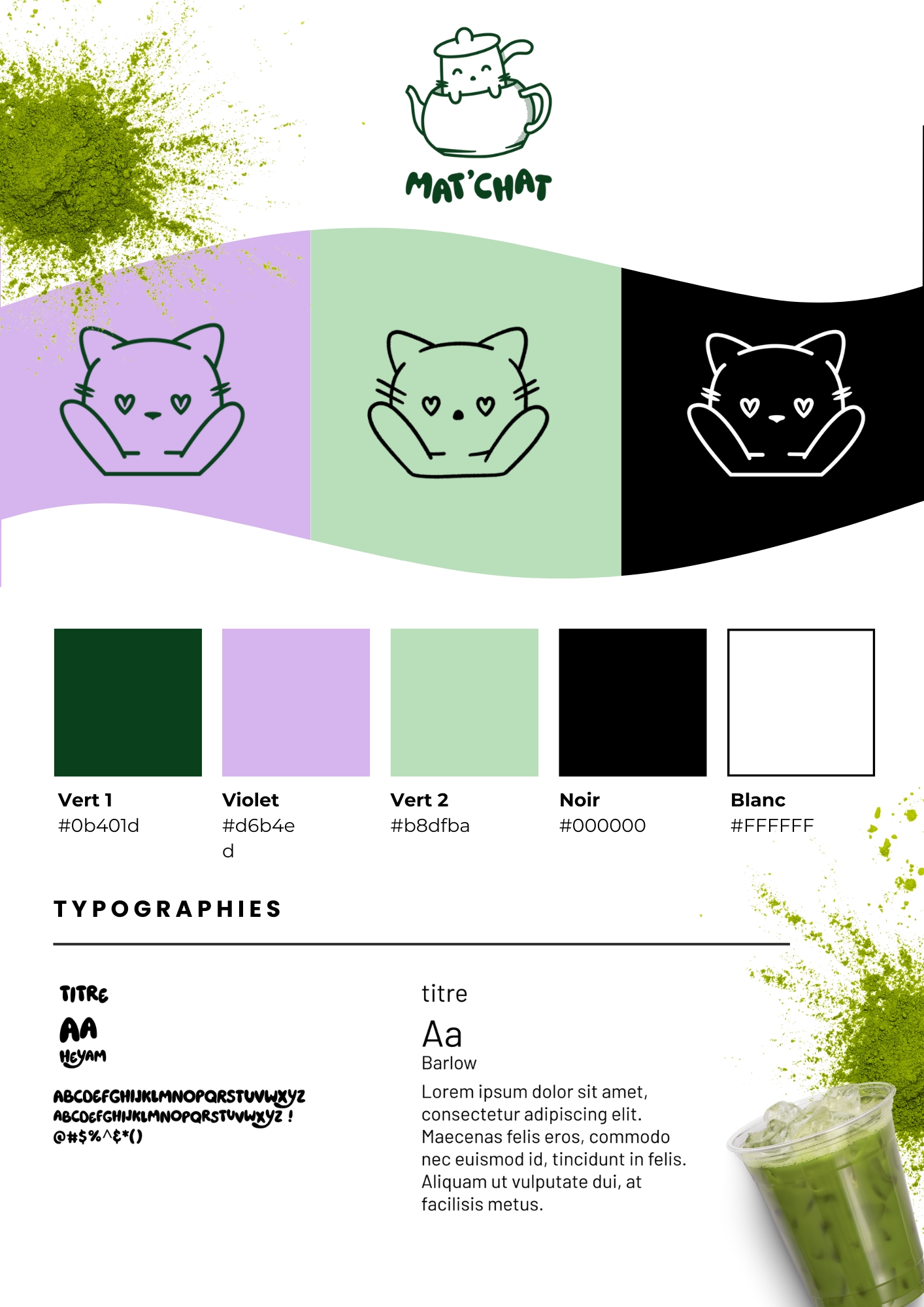 Ensemble, nous avons choisi le nom Mat’Chat, un jeu de mots combinant « matcha » et « chat », qui évoque à la fois notre produit phare et une touche ludique et chaleureuse. Cet esprit est renforcé par notre mascotte, un petit chat kawaii, inspiré de l’esthétique japonaise, qui incarne la douceur et l’authenticité du concept.